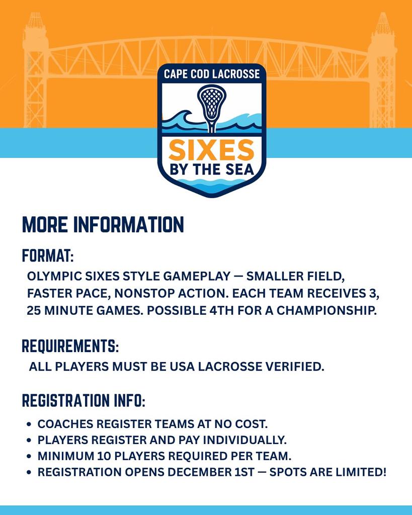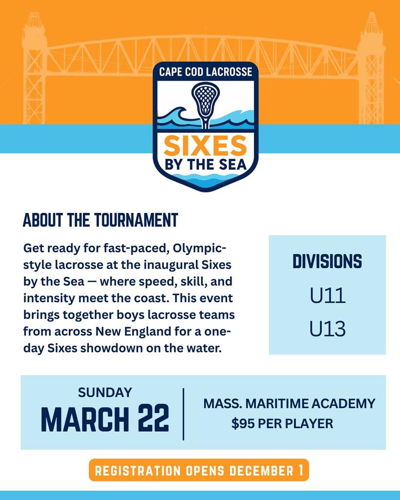 Get ready for fast-paced, Olympic-style lacrosse at the inaugural Sixes by the Sea — where speed, skill, and intensity meet the coast. Hosted at Mass Maritime Academy, this event brings together teams from across New England for a one-day Sixes showdown on the water.